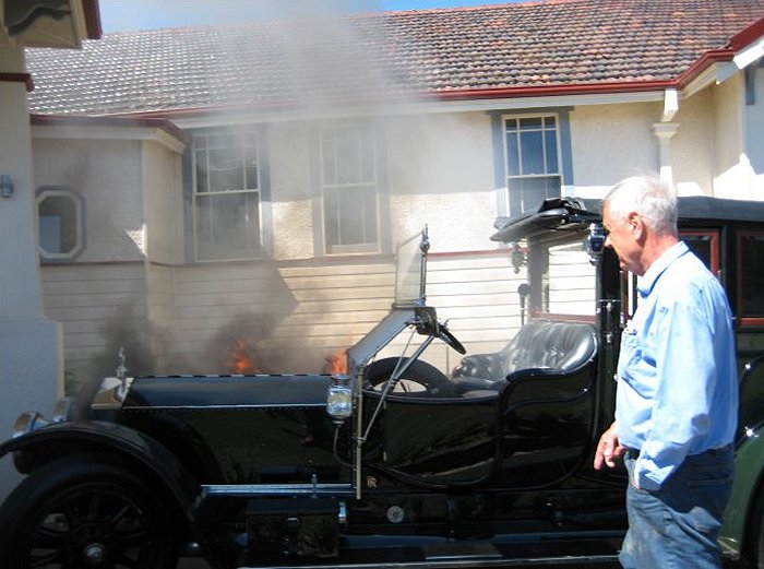 We arrived once again at our accommodation and checked in. Unfortunately, luck was not on Bill Hall’ s side. He unloaded his luggage to his room and then went to move his 1912 Silver Ghost to the parking area. When he re-started his car, it burst into flames. He jumped out and ran into the hotel shouting ” Has anyone got a fire extinguisher?”.