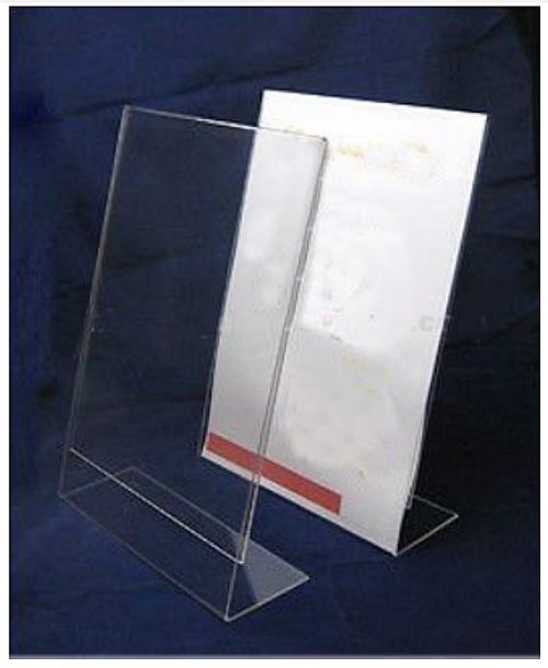 The example below is typical, just a sheet of stiff plastic folded to provide a slot and a foot. Available at your handy office supplies shack.