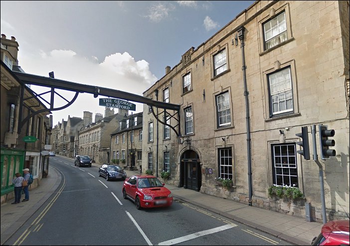 Yes, it is. In fact it’s a Stamford landmark, with a wrought iron arch spanning the full width of the Great North Road to the building opposite. And here it is, “The George, of Stamford”, on the right, a handsome establishment. The archway tells you it was a coaching in once, and no doubt in 1910 one took one’s 40-50 HP through the arch into the courtyard for the night. One doubts that it still sells petrol in 2 gallon tins… And the street scene tells you exactly why you don’t drive north along the old Great North Road any more, all narrow streets and traffic lights, but take the A1(M) instead.